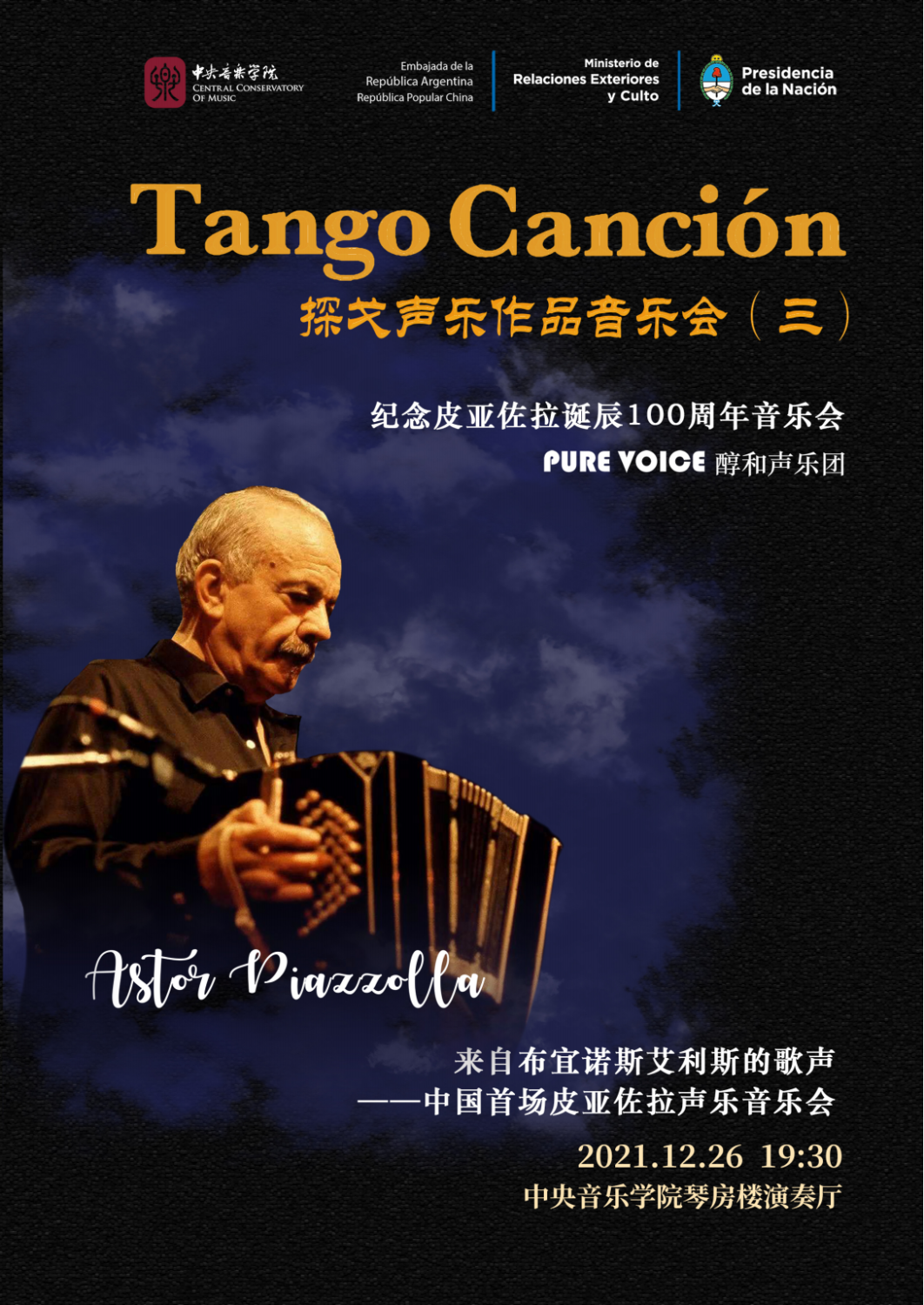 音乐会的主办方——星空彩票ios版中心版探戈艺术研究与实践中心,于2021年10月26日正式成立,是中国首个探戈艺术专业研究机构,得到了阿根廷驻华使馆、阿根廷国立艺术学院的支持。中心旨在通过开展探戈艺术的研究和推广实践活动,促进和加强中阿音乐文化交流和探戈艺术的发展,助力巩固中阿建交近五十年来的双边关系。