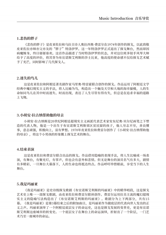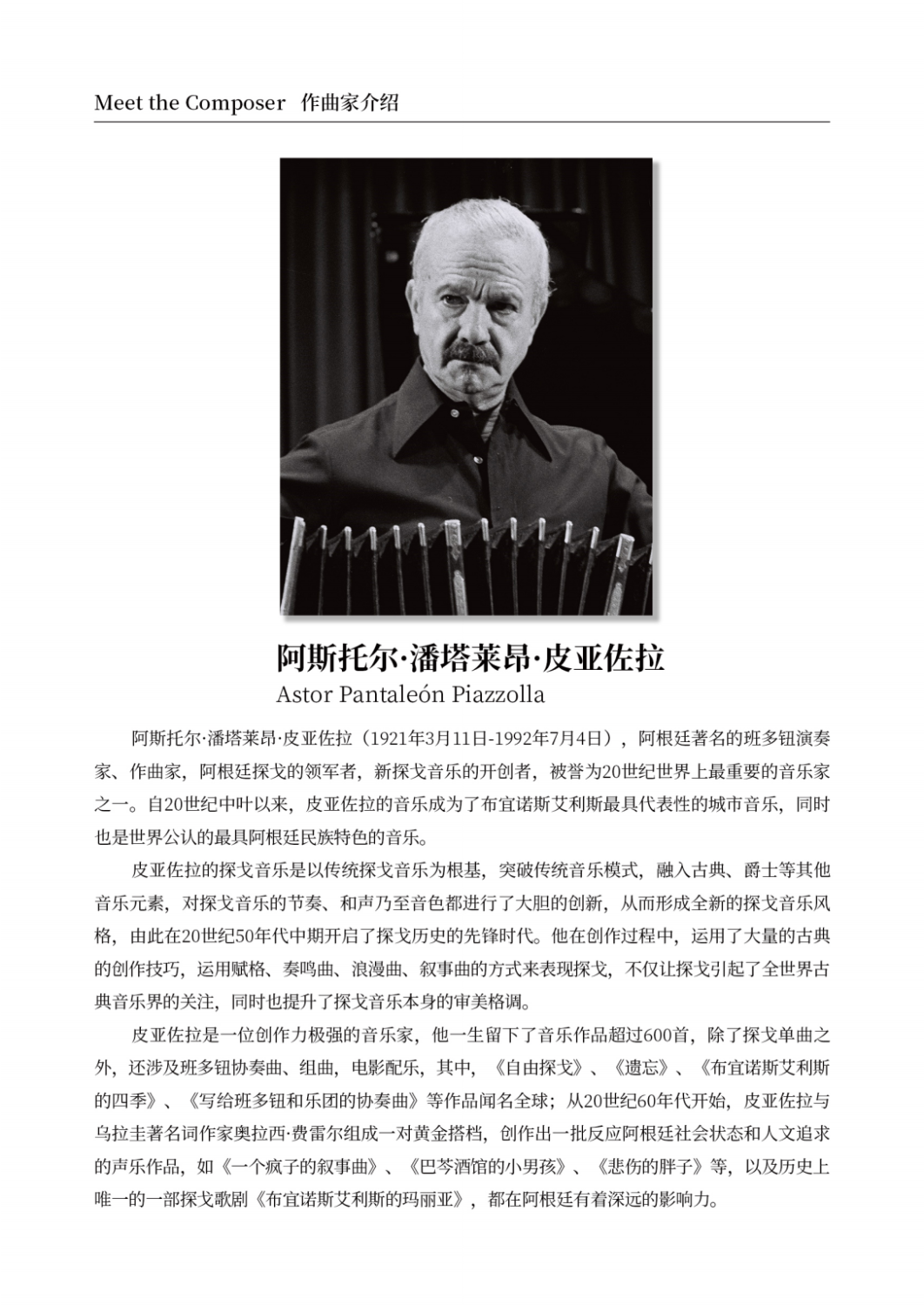 阿斯托尔·皮亚佐拉是近现代阿根廷首屈一指的探戈音乐家,为探戈音乐的推广和革新做出了重要贡献。他的器乐作品几十年来广泛活跃在世界各地的舞台上,但很少有乐团表演他的声乐作品。本次音乐会精心挑选并改编了他的七首声乐作品,将为听众呈现一个不一样的皮亚佐拉。