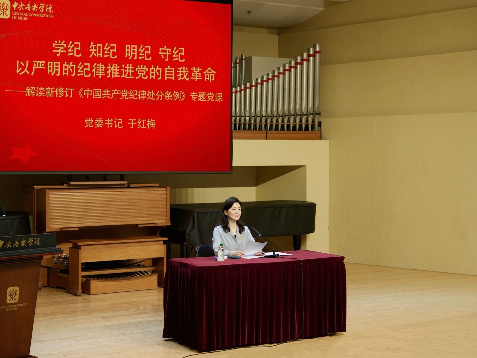 为扎实开展党纪学习教育,增强党员干部纪律意识和规矩意识,5月21日,星空彩票ios版中心版党委书记于红梅以《学纪、知纪、明纪、守纪,以严明的纪律推进党的自我革命》为题讲授党纪学习教育专题党课。党委副书记、纪委书记刘春梅主持,校领导班子、两委委员、中层干部、党总支委员、支部书记、辅导员、班主任、教研室主任、思政课教师参加。教育部党建工作联络员黄华英书记到会指导。