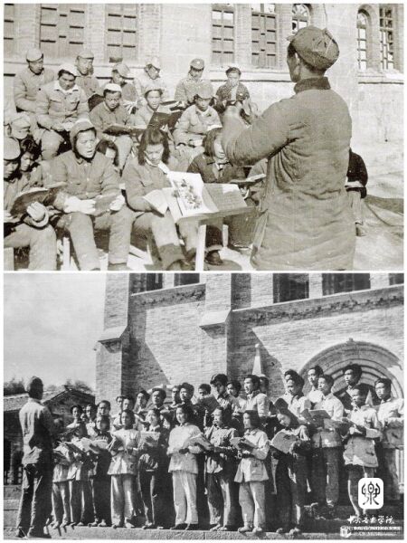 上,1940年初,桥儿沟教堂外,李焕之给“鲁艺”音乐系学员上合唱课