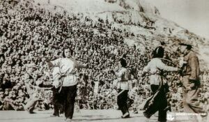 1943年春节,南泥湾,“鲁艺”慰问359旅演出秧歌舞《挑花篮》,前排左1李群