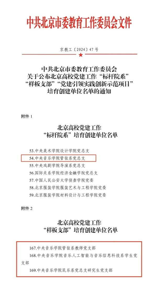 近期,北京市委教育工委公布了北京高校党建工作“标杆院系”“样板支部”“党建引领实践创新示范项目”培育创建单位名单。经过评选审核,我校管弦系党总支入选北京高校党建工作“标杆院系”,管弦系教师党支部、音乐人工智能与音乐信息科技系学生党支部、民乐系党总支研究生党支部入选北京高校党建工作“样板支部”。
