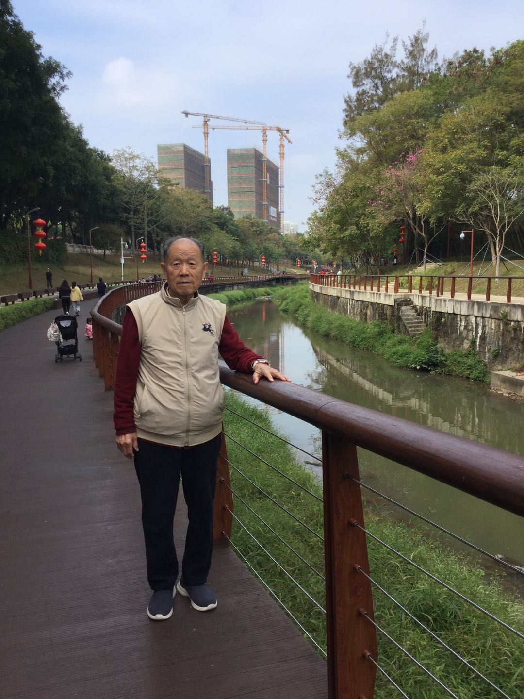 河边道路平坦宽阔,老人在散步,孩子在玩耍,年轻人在跑步、骑车锻炼身体……