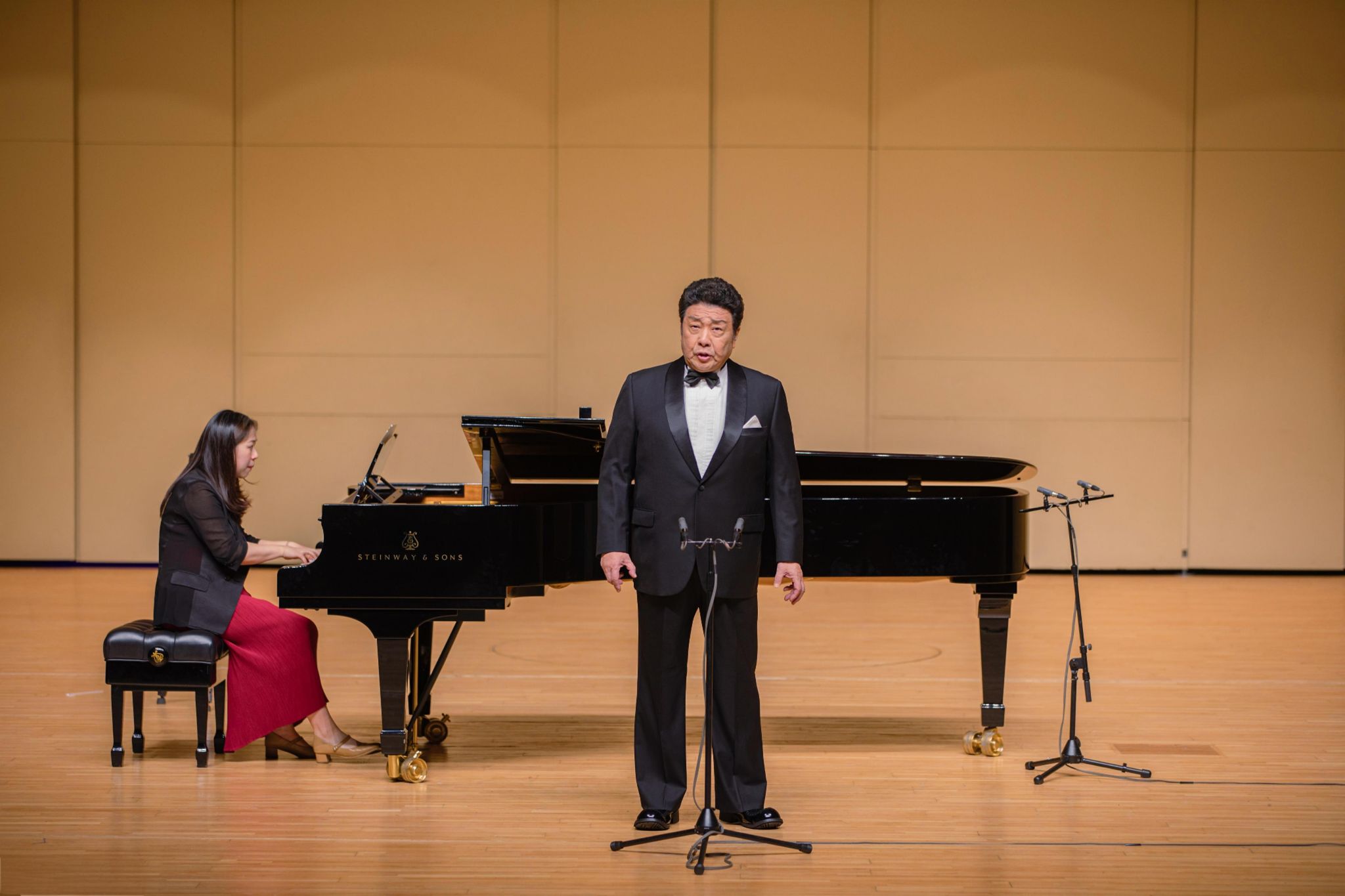 上半场,观众们还沉浸在诉说和温情的歌声中,仿佛将观众带入到那个激情燃烧的岁月。下半场一开始,张文巍老师就以其浑厚磁性的男低音完美演绎《我的祖国妈妈》,将现场氛围烘托到新的高度,随后又一经典的爱国歌曲《我爱你中国》由袁晨星老师演唱,华美的嗓音、真挚的情感和流淌的旋律交织在一起,对祖国的无限感激与深沉热爱依稀可见。