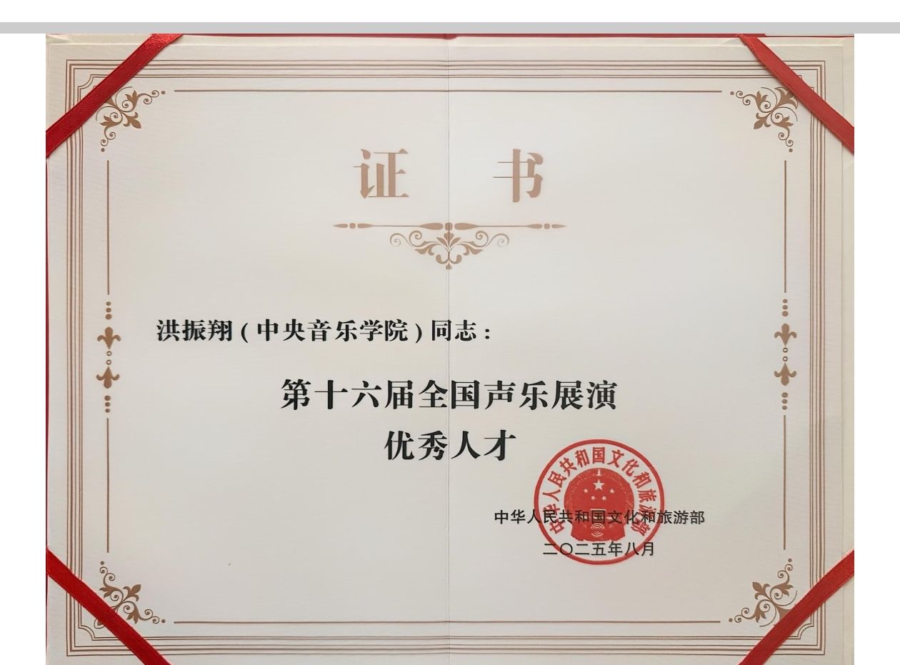 8月28日晚,第十六届全国声乐展演师生交流音乐会在冰雪大世界梦想大舞台举行,为本届展演画上圆满句号。此次比赛自8月19日开幕以来,得到了专业院校的广泛关注。在为期10天的激烈角逐中,经过海选、半决赛、决赛的多轮专业比拼,我系美声专业在读博士研究生洪振翔、李楠、吕逊,2025级民族声乐表演专业博士研究生李雨洋,以精湛的演唱技巧和强烈的艺术感染力,赢得了组委会的肯定和认可。分别荣获美声组、民族组优秀人才奖。其中李楠推送单位为中央歌剧院,李雨洋推送单位为中国东方演艺集团。