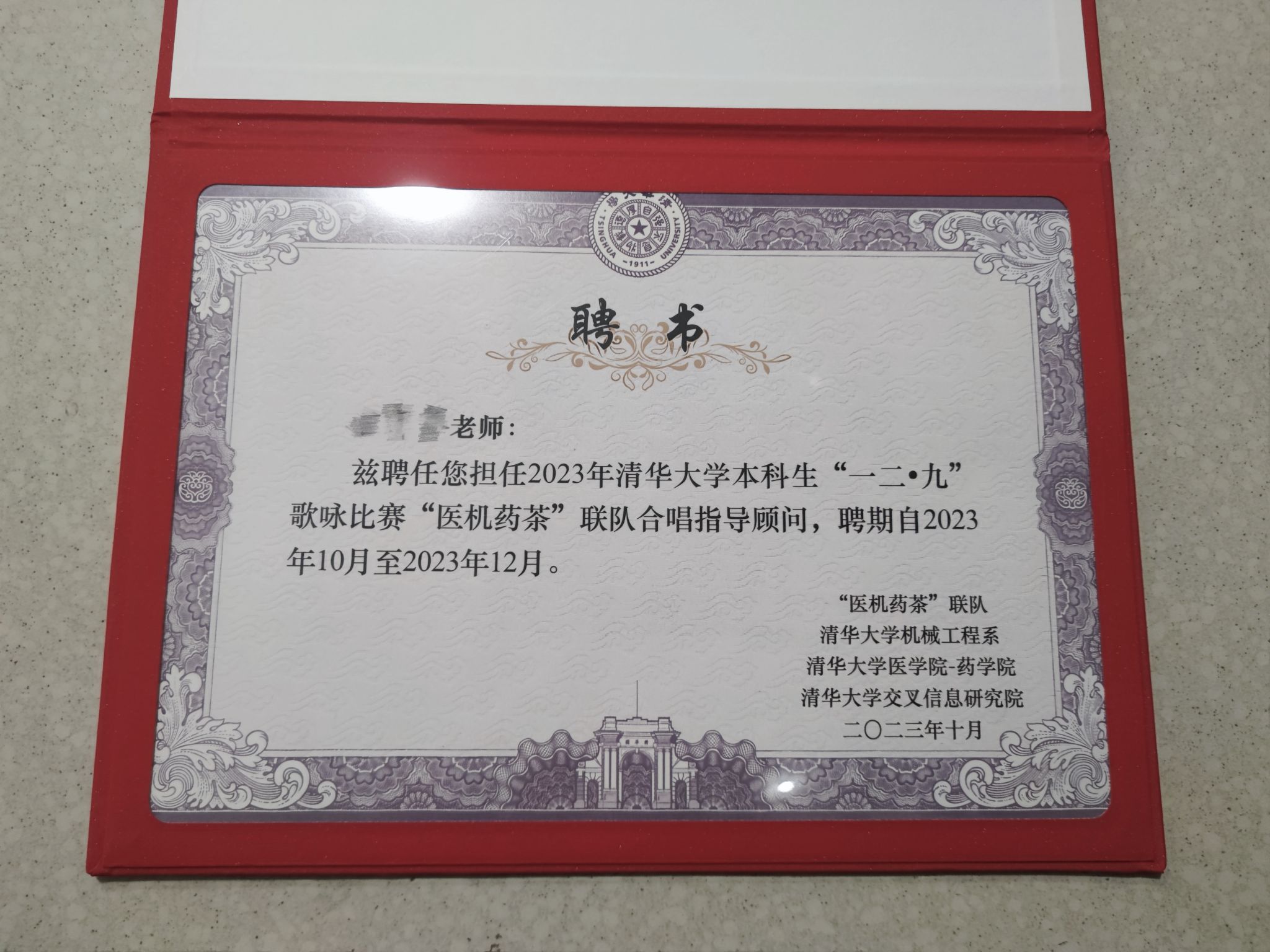 感谢院领导赋予我这一次机会能够参与到2023年清华大学本科生“一二·九”主题教育活动当中,与“医机药茶”联队的同学们度过美好的一学期。在短短几个月中我清晰地感受到清华学子的精神面貌,他们刻苦认真、严谨负责,对音乐充满了热爱。无论是排练过程中大家的全力以赴、奋勇前进,还是对于音乐学习的刻苦钻研、虚心请教,他们都能不断地突破自己,每一处都彰显了清华学子的优秀品质。从他们的身上我真切地感受到了“一二·九”精神,他们在面对困难和挫折时总能保持坚定的信念和勇气,不屈不挠地追求目标,这样的努力和付出令人敬佩,我想这也正是这次活动的意义。这次活动不仅仅展示了同学们的才华与能力,更是锻炼意志和培养团队精神的过程。非常荣幸能够与他们结识并参与这次活动,这是一段美好而幸福的经历,这段经历也将成为我宝贵的回忆留存心间!