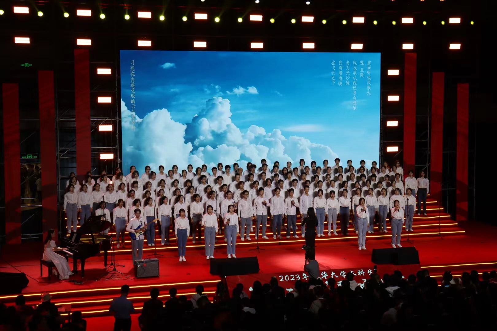 电子工程系合唱联队选择《百年守望》作为参赛曲目,陶源同学、韩诗童同学与朱哲琦同学承担合唱改编、排练、指挥、舞蹈编排工作并分别作为合唱团员和钢琴伴奏参与演出。