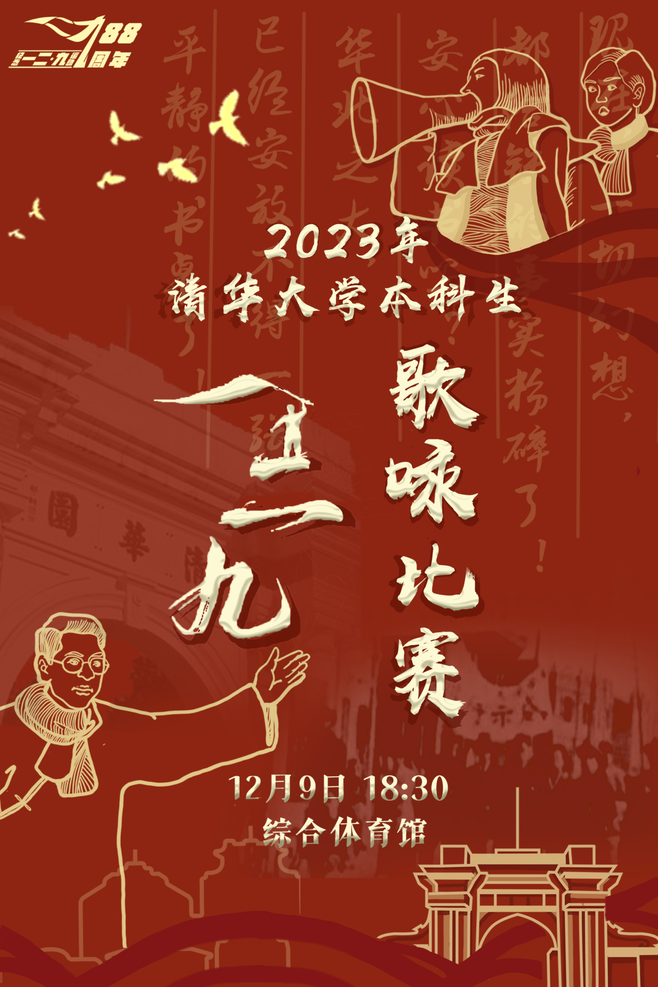 1935年的“一二·九”抗日救亡运动是中国共产党领导的一次大规模学生爱国运动,清华、燕京等校学生开展了抗日救国请愿大游行,推动了抗日民族统一战线的建立。自1988年起,清华大学正式以唱诵爱国歌曲的形式开展“一二·九”运动纪念活动,于每年12月举办“一二·九”歌唱比赛,弘扬“爱国、奉献、成长、担当”的“一二·九”精神,勉励广大青年学子铭记历史、缅怀先烈,继承优秀革命传统,践行社会主义核心价值观,树立成才报国的远大理想,肩负起时代赋予的青年责任。