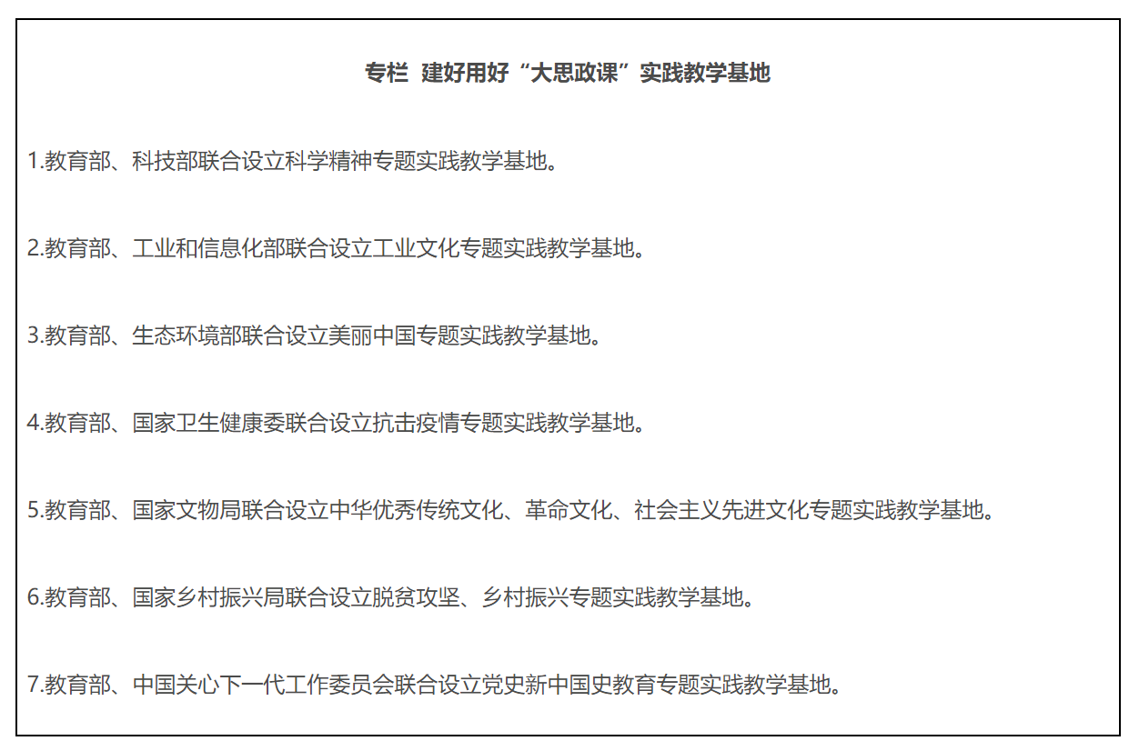 10.建好用好实践教学基地。教育部会同有关部门,利用现有基地(场馆),分专题设立一批“大思政课”实践教学基地。发挥好教育部高校思政课教师研学基地的实践教学功能。各地教育部门要结合实际,积极建设“大思政课”实践教学基地。大中小学要主动对接各级各类实践教学基地,开发现场教学专题,开展实践教学。有条件的学校可与有关基地建立长效合作机制,加强研究和资源开发。各基地要积极创造条件,与各地教育部门、学校建立有效工作机制,协同完成好实践教学任务。