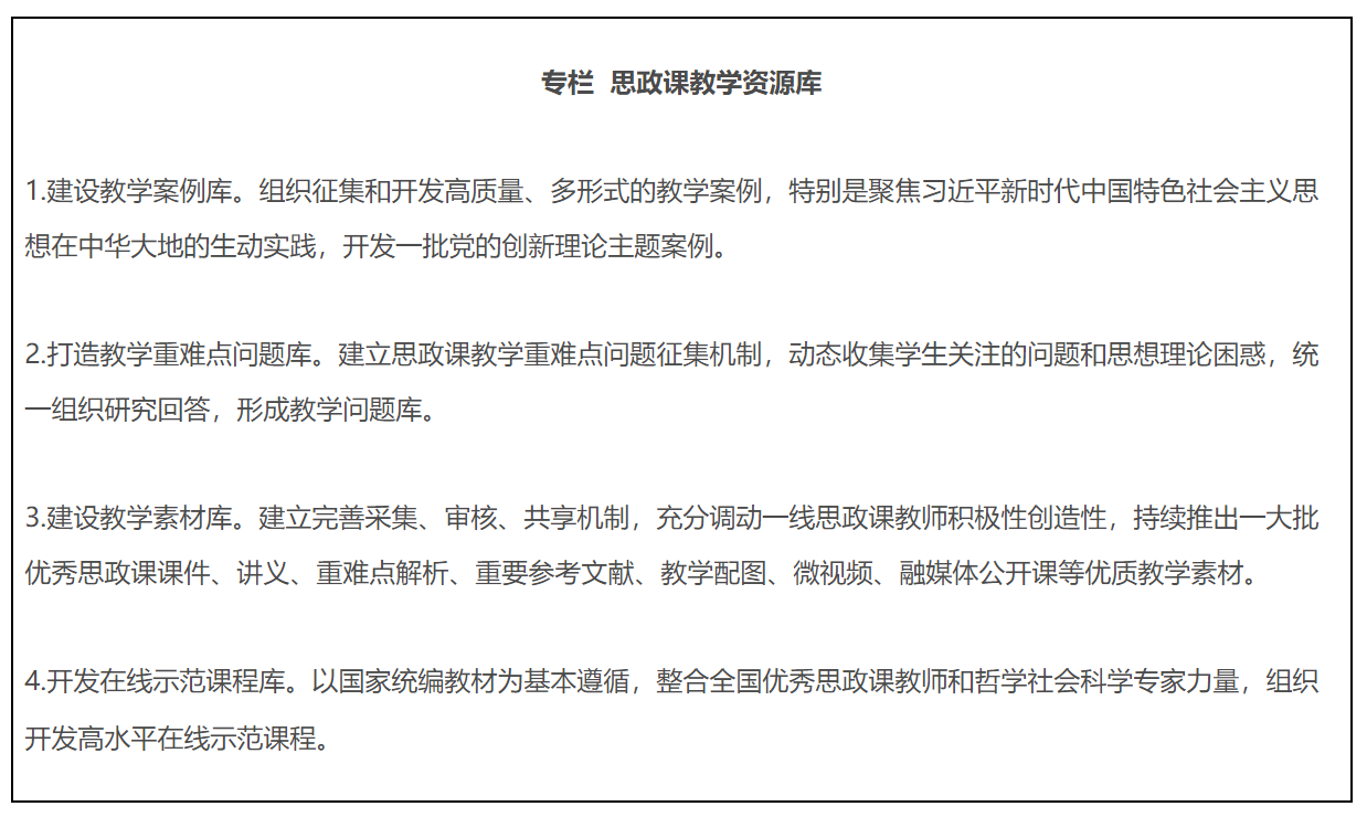 19.全面推进课程思政高质量建设。教育部组建高等学校课程思政教学指导委员会,研制普通本科专业类课程思政教学指南,组织开展高校教师课程思政教学能力培训,建设一批课程思政系列共享资源库。建成一批课程思政示范高校,推出一批课程思政示范课程,选树一批课程思政教学名师和团队,建设一批高校课程思政教学研究示范中心。加强中小学学科德育建设。
