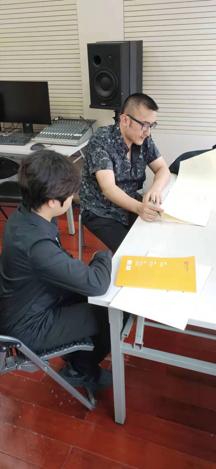 黄若教授在个别课上对A组学员任泽辰的作品《玄》的想法、和声感给予了充分的肯定,而就ABCBA的拱形结构提出了自己的建议。黄若教授认为,最后的部分与其做较为明显的再现,去给首段的材料“扣题”,不如将材料进一步展开,使结尾“别有洞天”去扣全曲“玄”之题,则更加贴合创作意图。黄老师鼓励学生根据创作意图的需要对传统的规则作出突破,在获得预期效果的同时还能使作品不落窠臼。