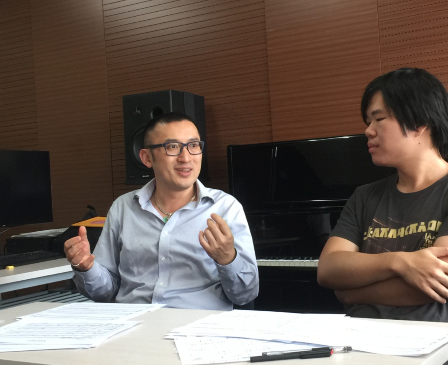 Lampson 和Dzubay 两位教授针对中西乐器兼容,以西方作曲家、指挥家的视角提出了一个实际的问题:中国民族音乐中许多口传心授的技艺与韵律,是西方指挥、演奏员难以理解的。因此,建议学生们作品中涉及此类因素时,想办法尽可能地将预期音响效果在谱面上清晰地体现出来,以传达给指挥和演奏员,使其在最大程度上实现创作者对音响的期待。