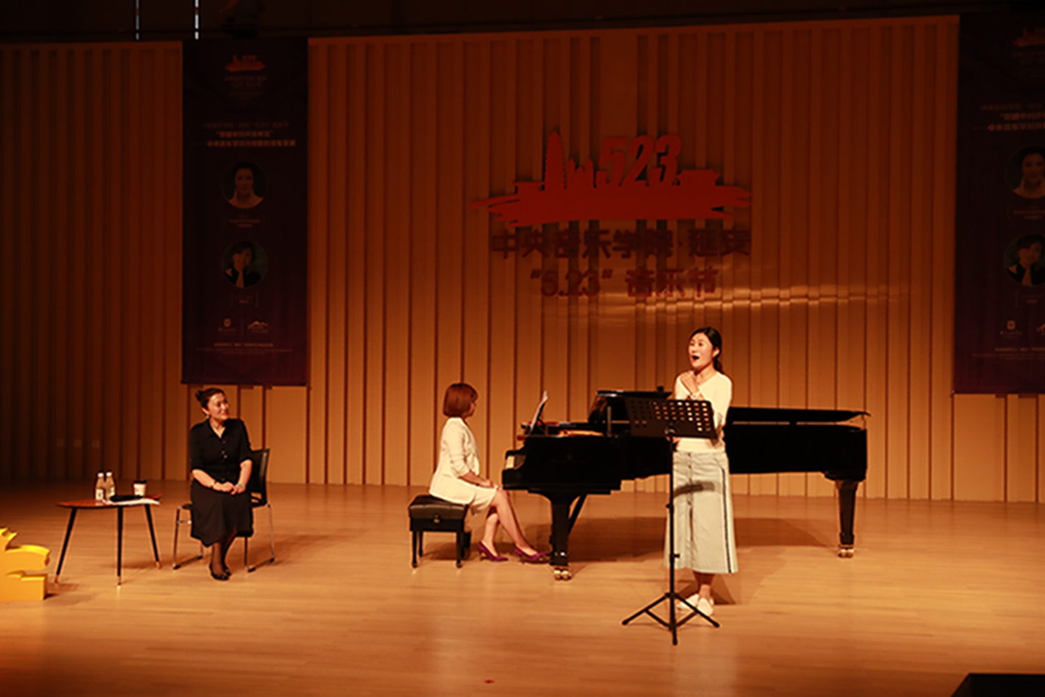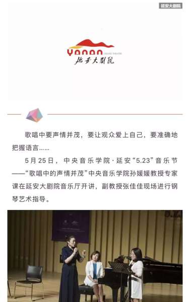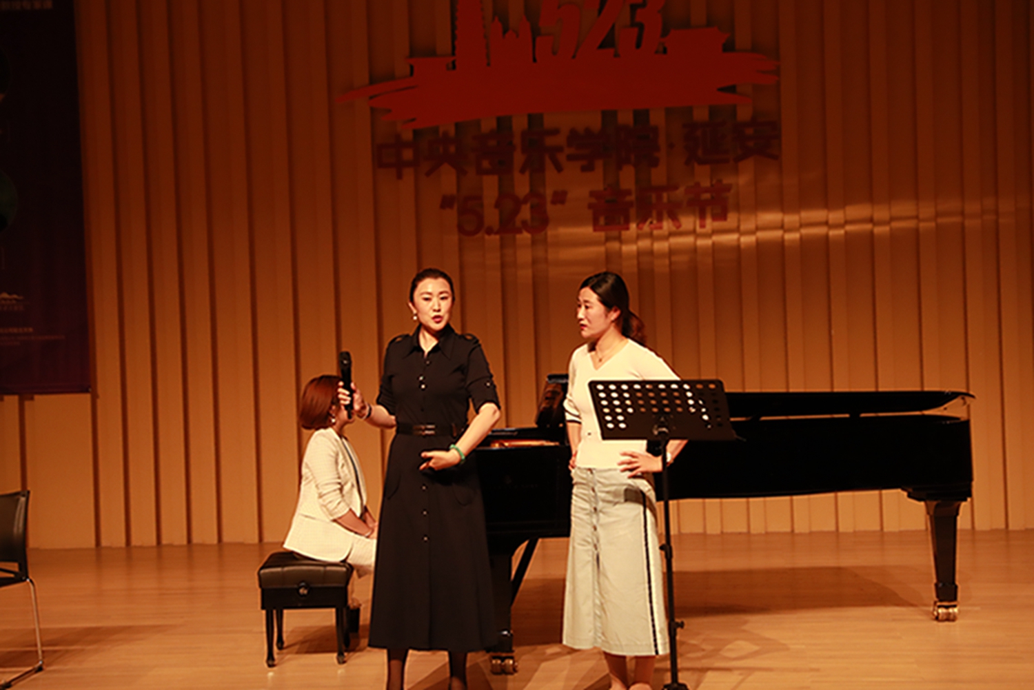 5月25日,星空彩票ios版中心版·延安“5.23”音乐节——“歌唱中的声情并茂”声乐歌剧系孙媛媛教授专家课在延安大剧院音乐厅圆满举行。孙媛媛教授对延安的音乐教师进行了声乐指导,张佳佳副教授担任钢琴艺术指导。