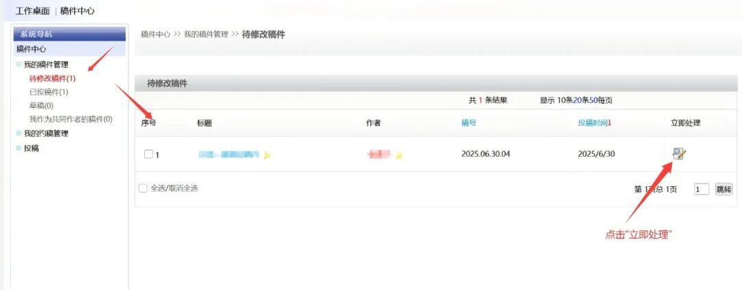 以作者角色登录系统后,在【稿件中心】下【我的稿件管理】中可以查看投稿情况。