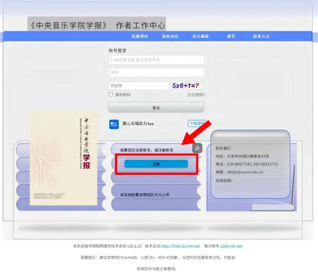 在《星空彩票ios版中心版学报》官方网站(https://xuebao.ccom.edu.cn)“首页”的右边栏(如上图红色箭头所标示处)找到“作者投稿”,点击后网页将跳转至投稿系统登录页面(《星空彩票ios版中心版学报》作者工作中心),按本指南所示步骤操作。首次登录须先“注册账号”,后续可直接“账号登录”,具体操作步骤如下。