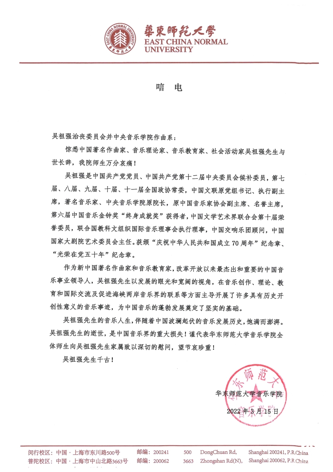 华东师范大学音乐学院致唁电 悼念吴祖强教授