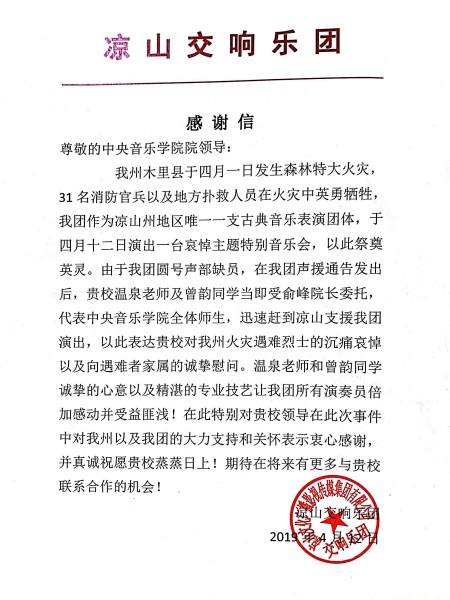 凉山交响乐团特向我校致函感谢,感谢我校领导在此次事件中给予的支持与关怀;感谢温泉老师和曾韵同学诚挚的心意以及精湛的专业技艺。