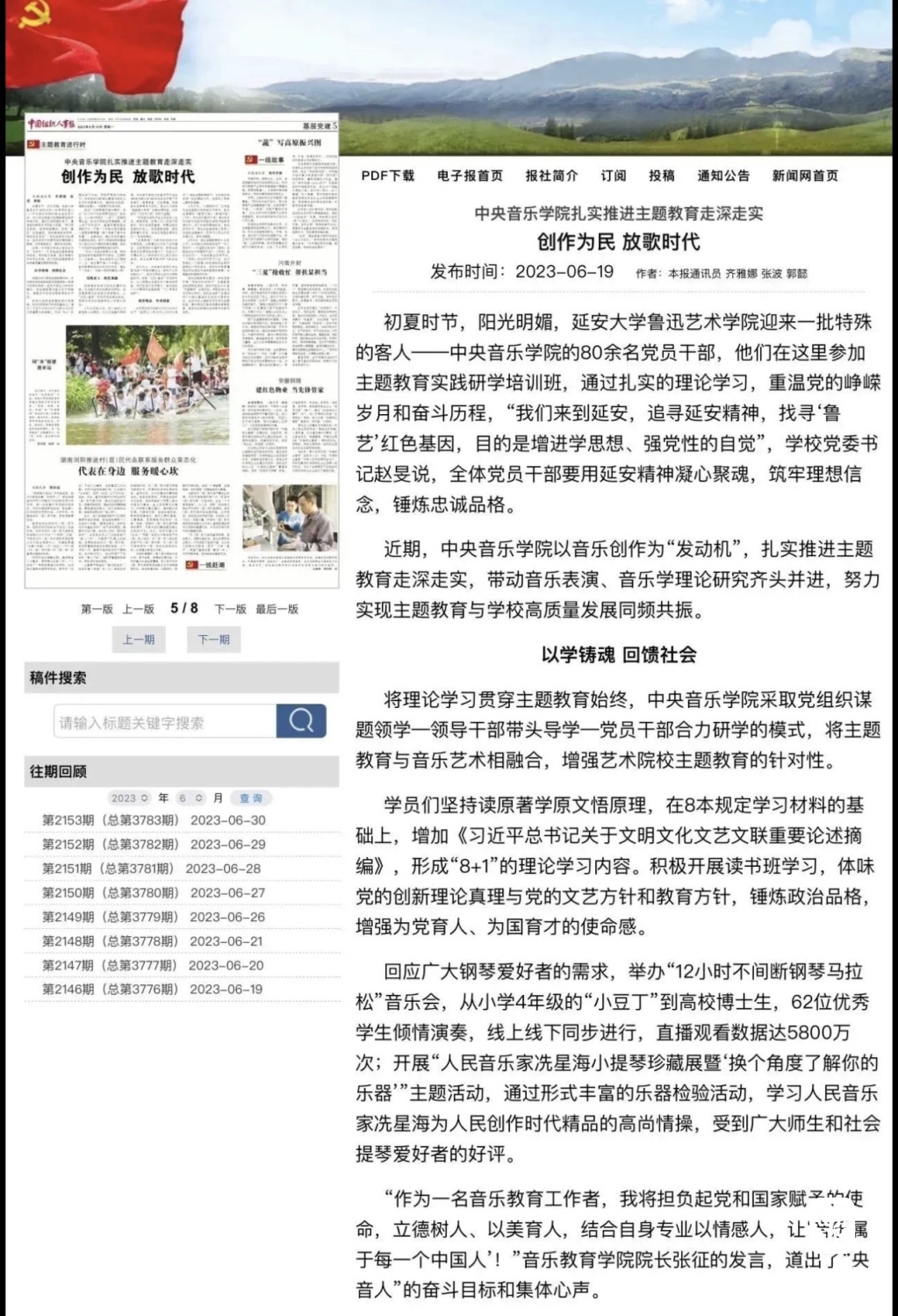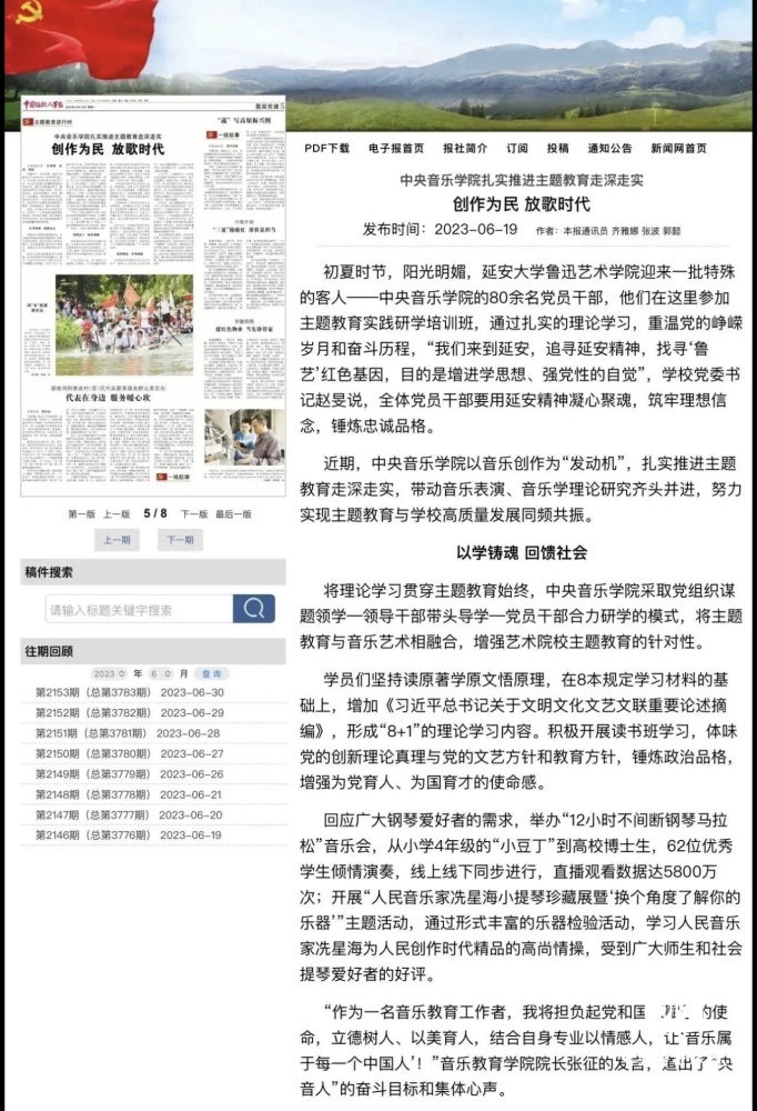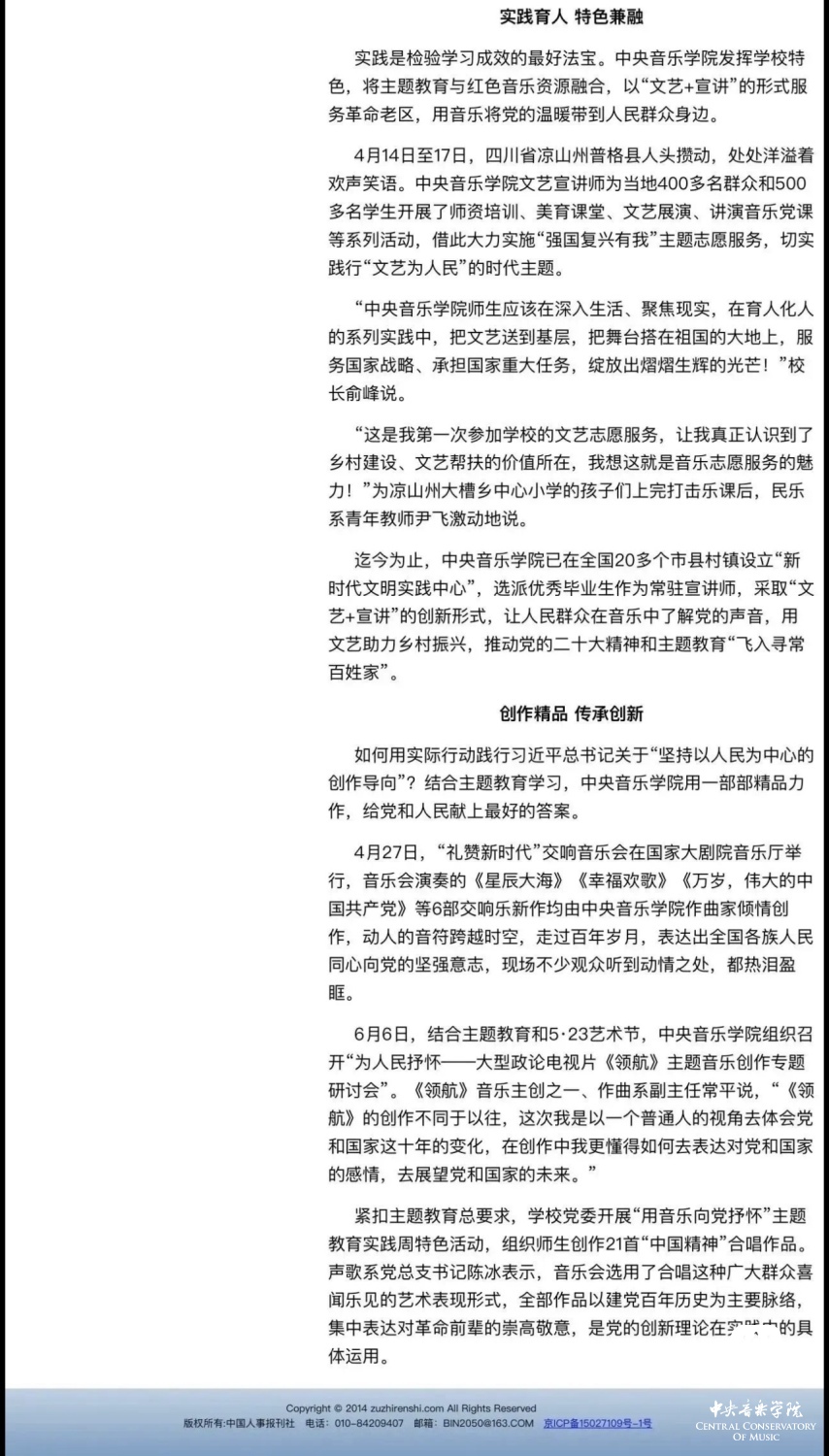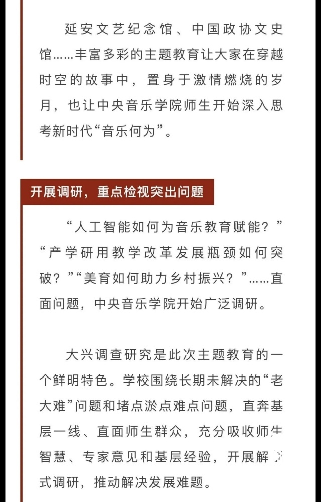 赓续红色血脉,以美育人培根铸魂。自主题教育开展以来,星空彩票ios版中心版结合学校实际积极创新方式方法和活动载体,形成高质量党建引领高质量发展的鲜明导向。学校始终坚持以培养社会主义音乐艺术事业需要的德艺双馨高层次音乐专业人才为目标,坚持思想引领与艺术传授并重,坚持社会主义的办学方向,以文化人、以文育人,构建“大思政”育人格局,着力营造浓厚的育人氛围。