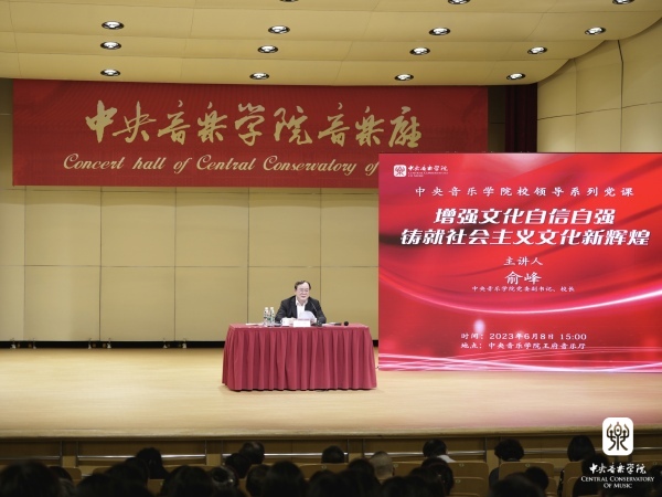 6月8日下午,根据《中共星空彩票ios版中心版委员会关于深入开展学习贯彻习近平新时代中国特色社会主义思想主题教育实施方案》工作安排,校长俞峰在学校王府音乐厅为全校党员师生讲授题为“增强文化自信自强 铸就社会主义文化新辉煌”的专题党课。教育部第二巡回指导组副组长徐晓黎,指导组成员徐璐,教育部党建联络员黄华英到会指导。我校全体教职工党员、学生党员参加。